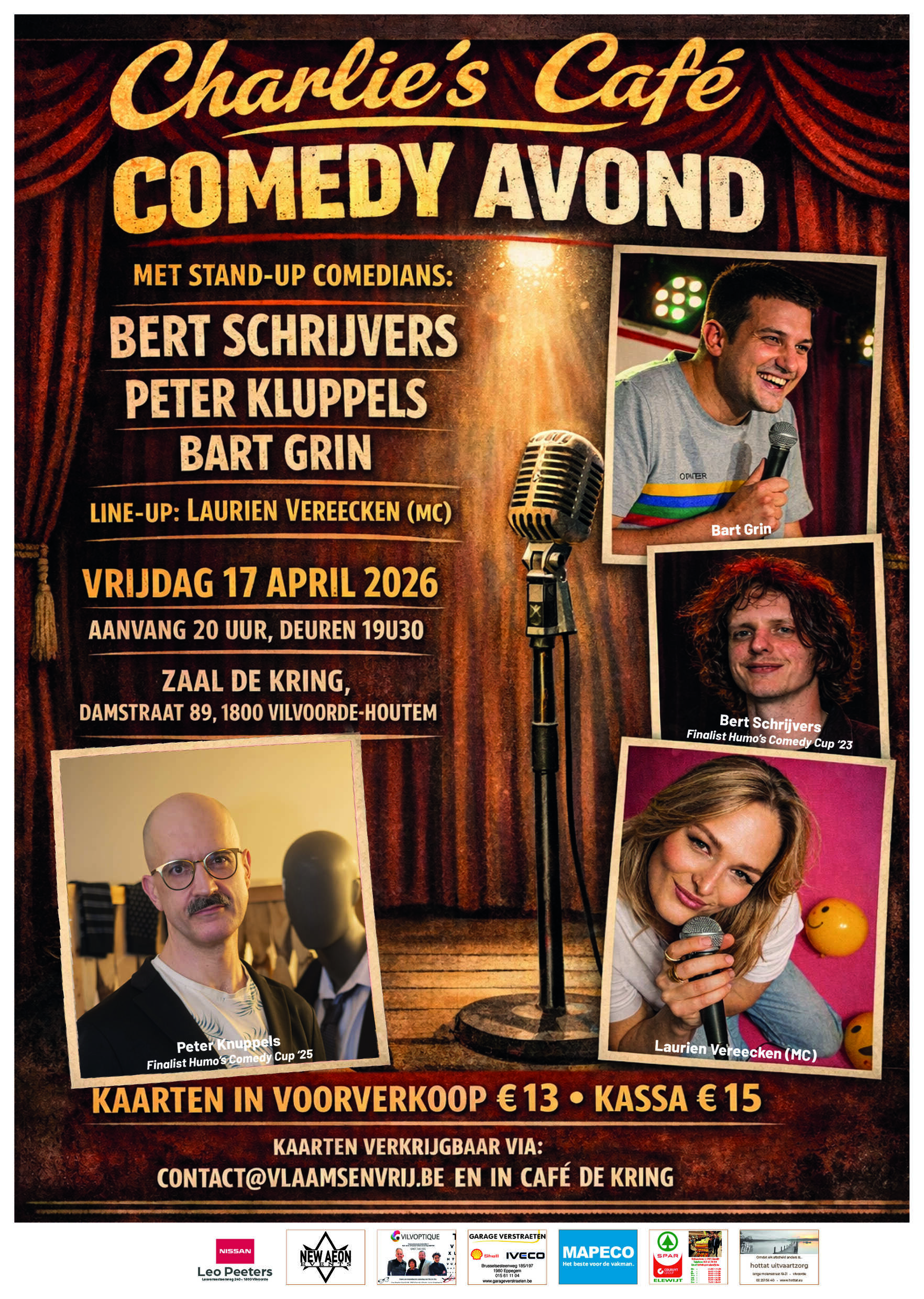 Op vrijdag 17 april openen we, zoals jaarlijks, ons kermisweekend met Charlie's Café. Verwacht dit jaar geen muzikale line-up maar wel een goede training voor je lachspieren! Kom daarom naar deze Comedy Avond met als line-up: